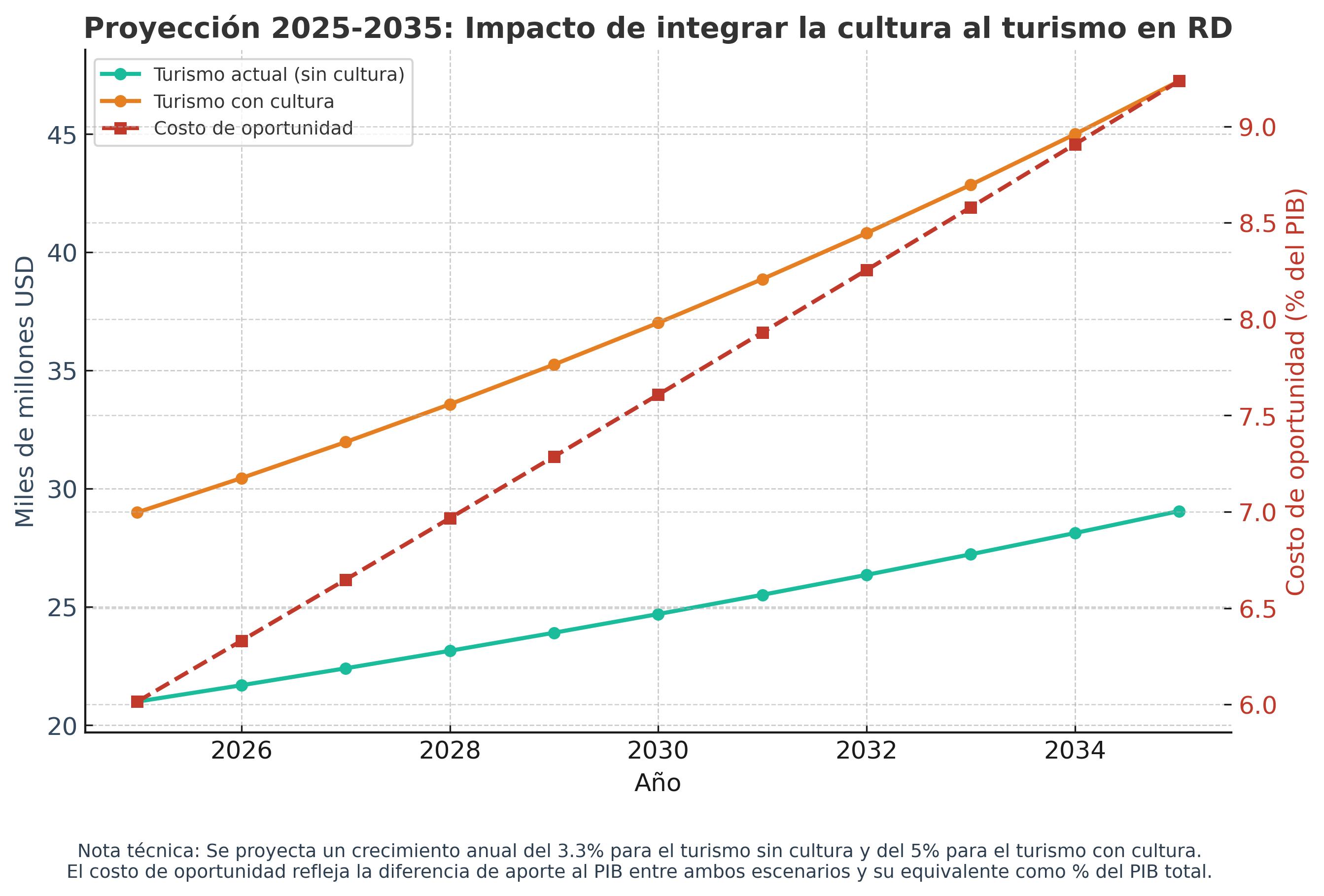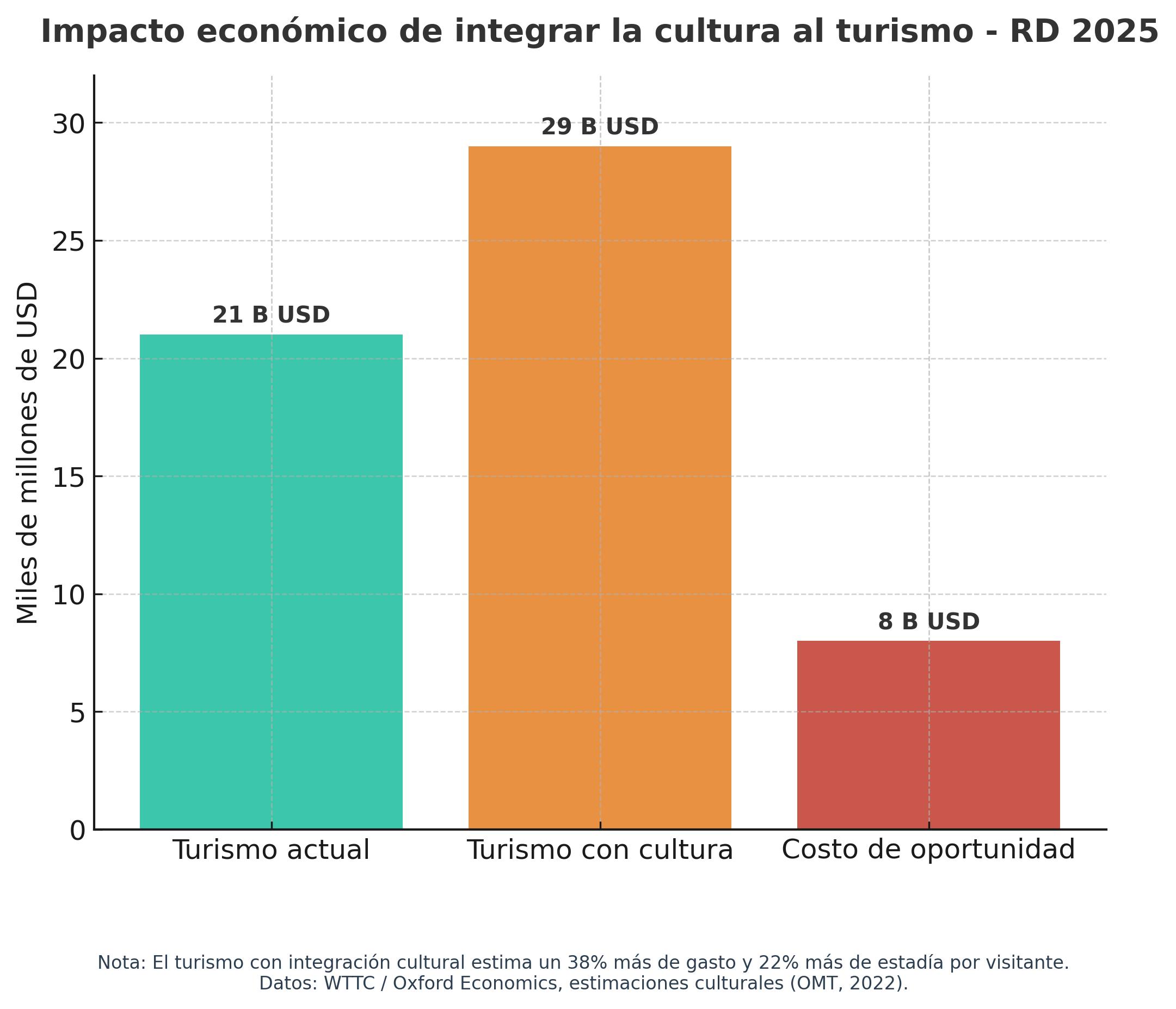 Para este 2025 se proyecta que el sector turismo aportará más 21 mil millones de dólares al PIB, equivalentes al 15.8% de la economía nacional (WTTC/Oxford). Dicho esto, el costo de oportunidad estimado por no integrar la cultura de forma estratégica al turismo podría ser de más de 8 mil millones de dólares anuales, equivalentes a cerca del 6% del PIB.